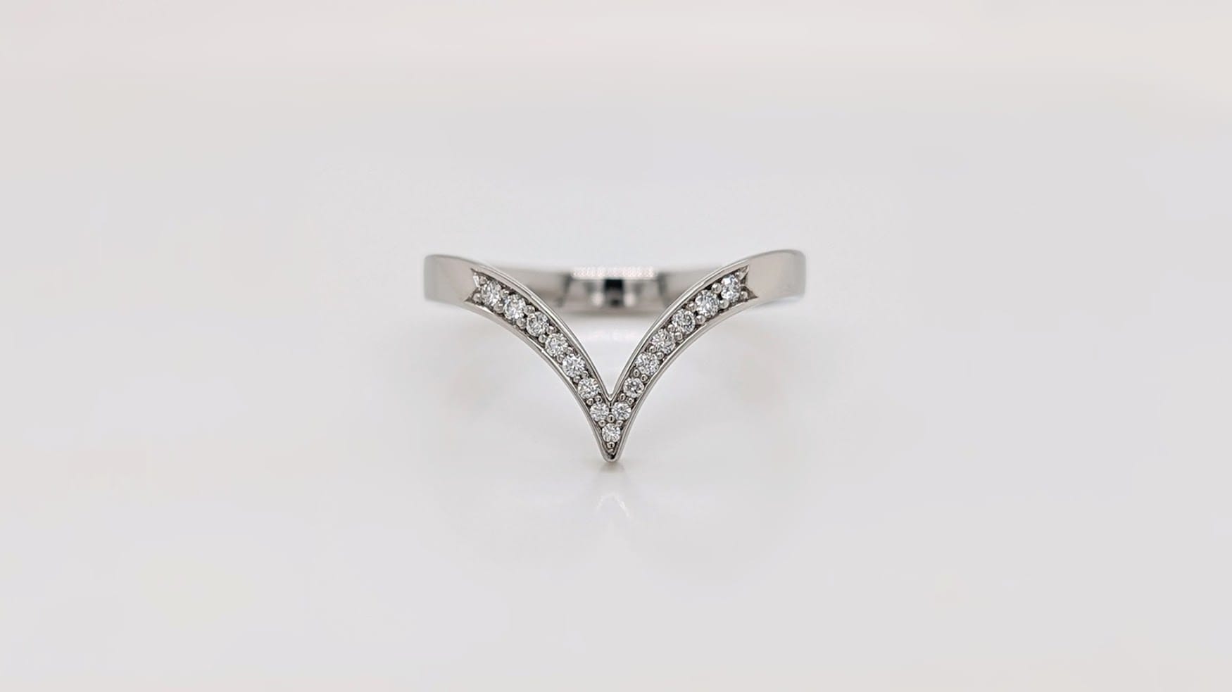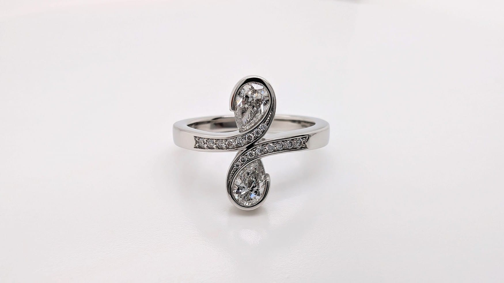 The platinum ‘toi et moi’ engagement ring is set with two half carat, pear-shaped diamonds in the sweeping curve of the band. These are highlighted with sixteen small, brilliant-cut diamonds, pavé set as the two sides of the band meet in the centre. The platinum wishbone wedding ring is also pavé set with fifteen complementing diamonds.