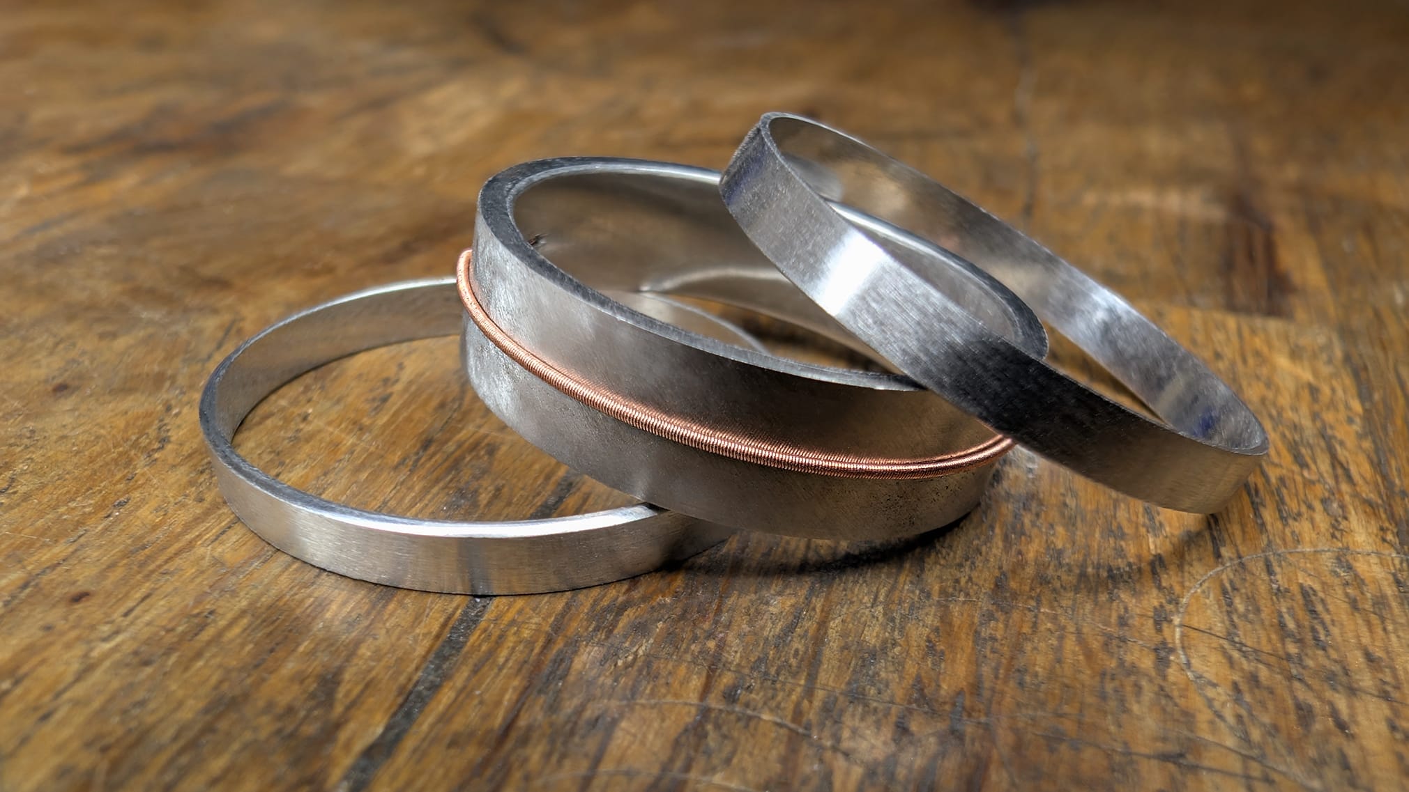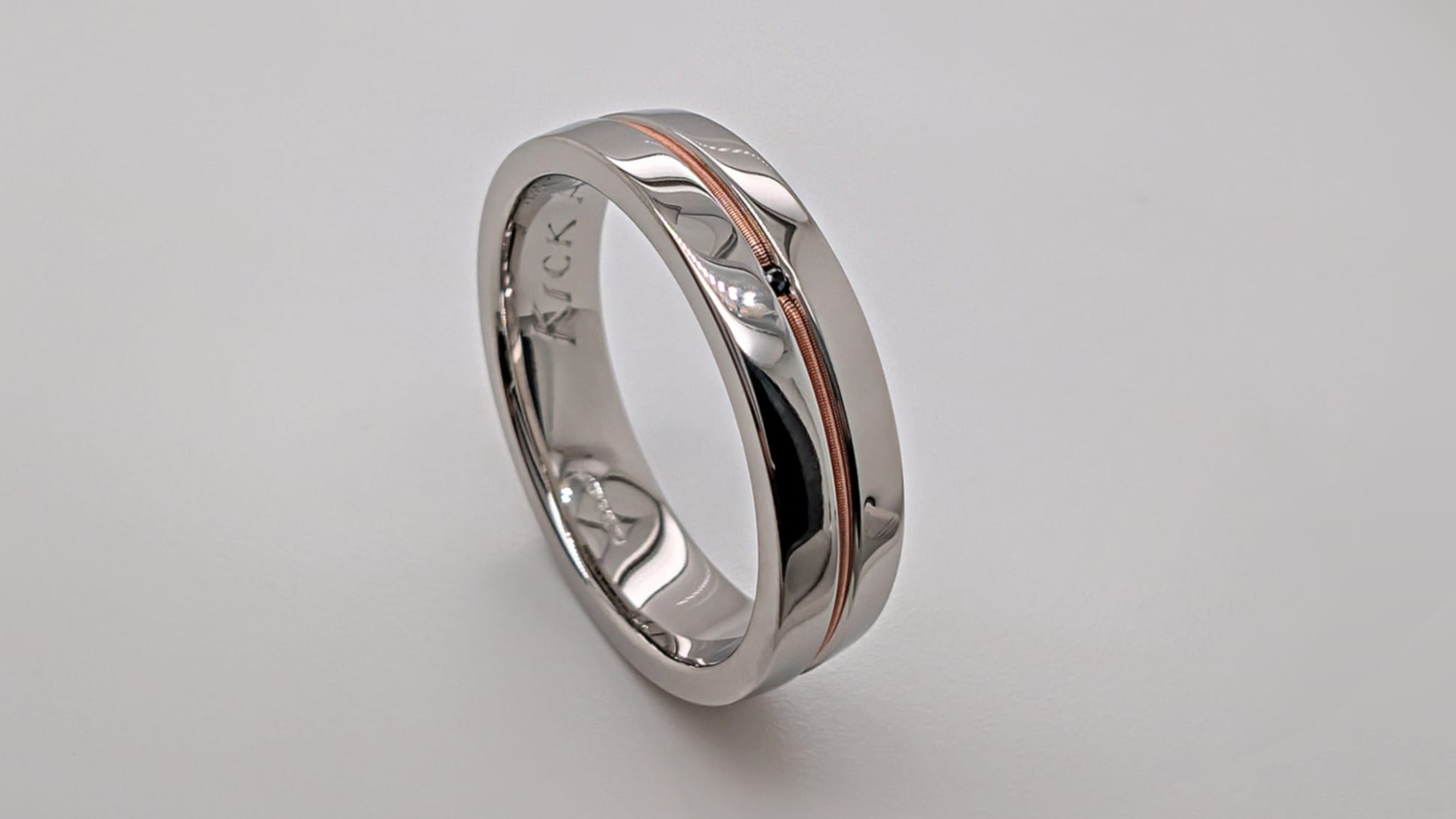 Kieran is, amongst many other things, a very talented musician, so when his sister Kate came up with the idea to incorporate a guitar string into the design we got our thinking caps on and came up with this. A platinum band, made using family platinum for added sentimental value, set with a copper guitar string and small black diamond. The ring is also engraved with a personal inscription from Kieran’s family.