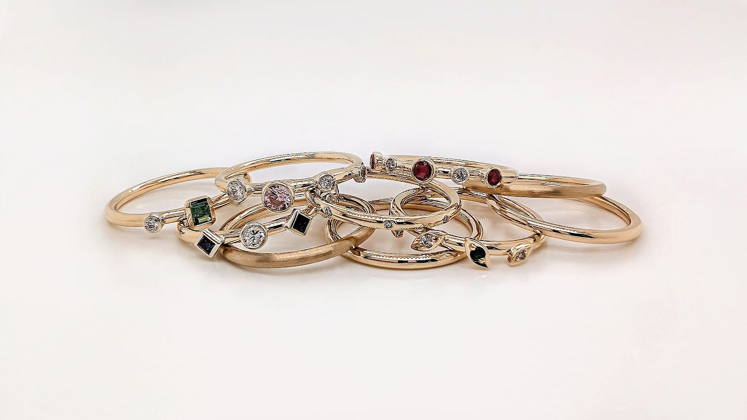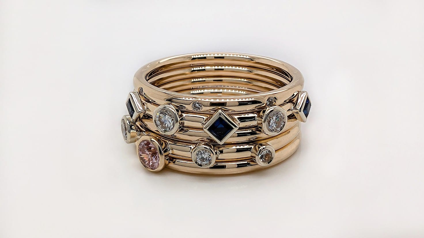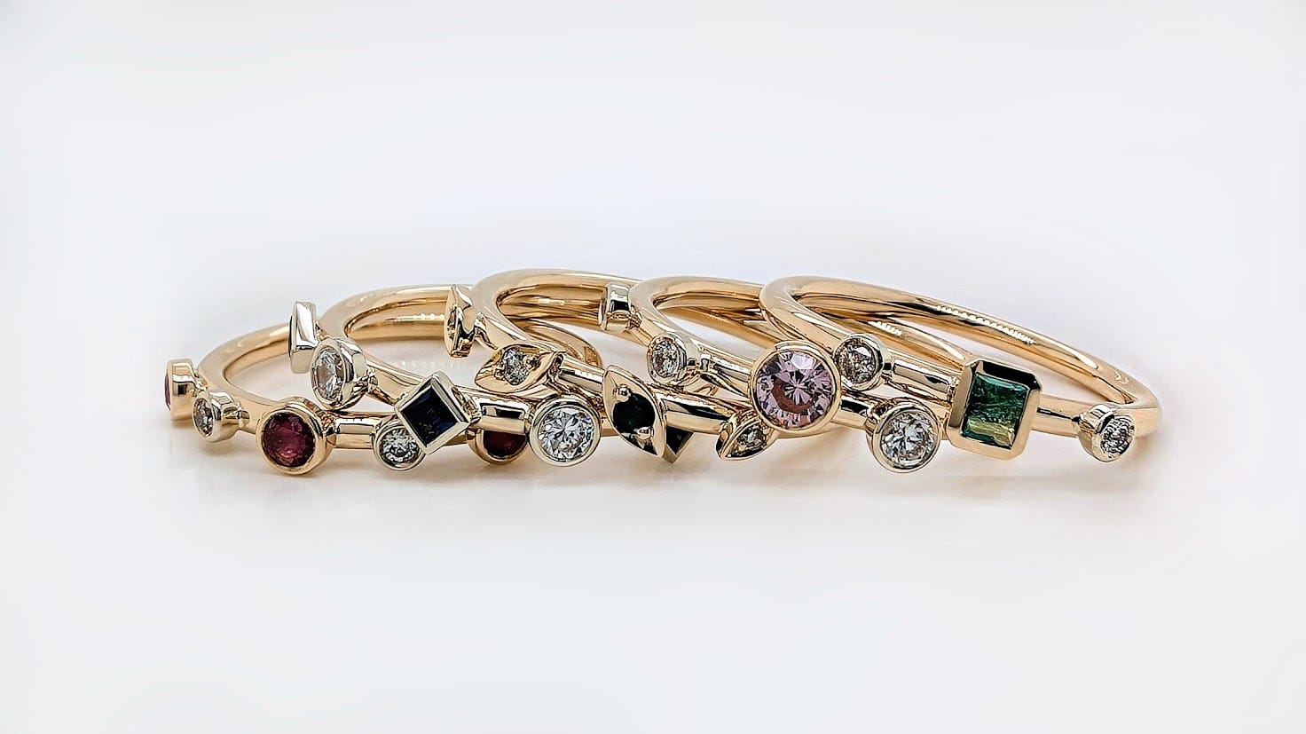 These pieces were created as a continuation of the intricate Sentimental Floral Ring. As there was a large quantity of sentimental material left over after completing the floral ring, we discussed design options that would allow her to wear the different coloured stones and metals in multiple combinations.