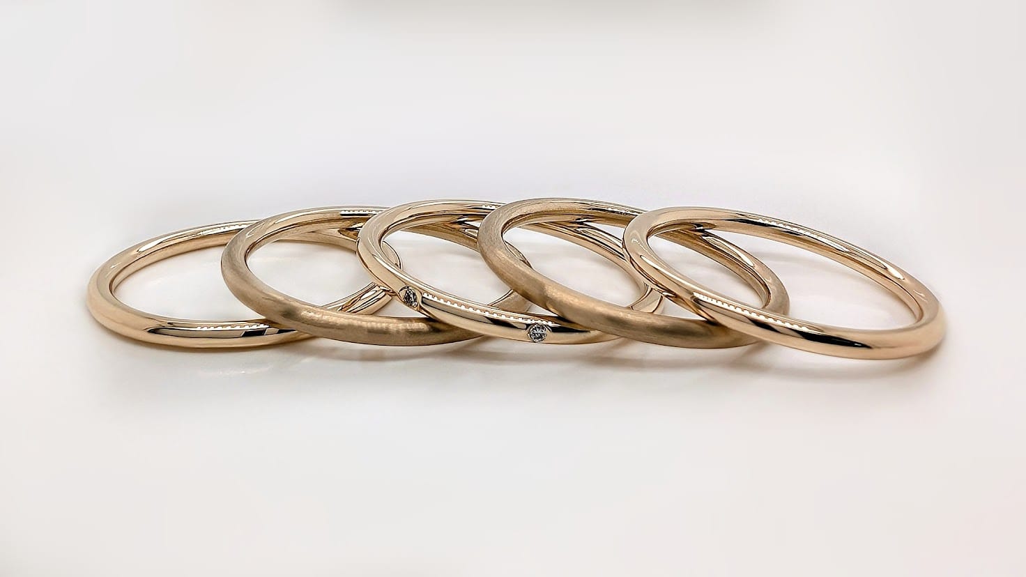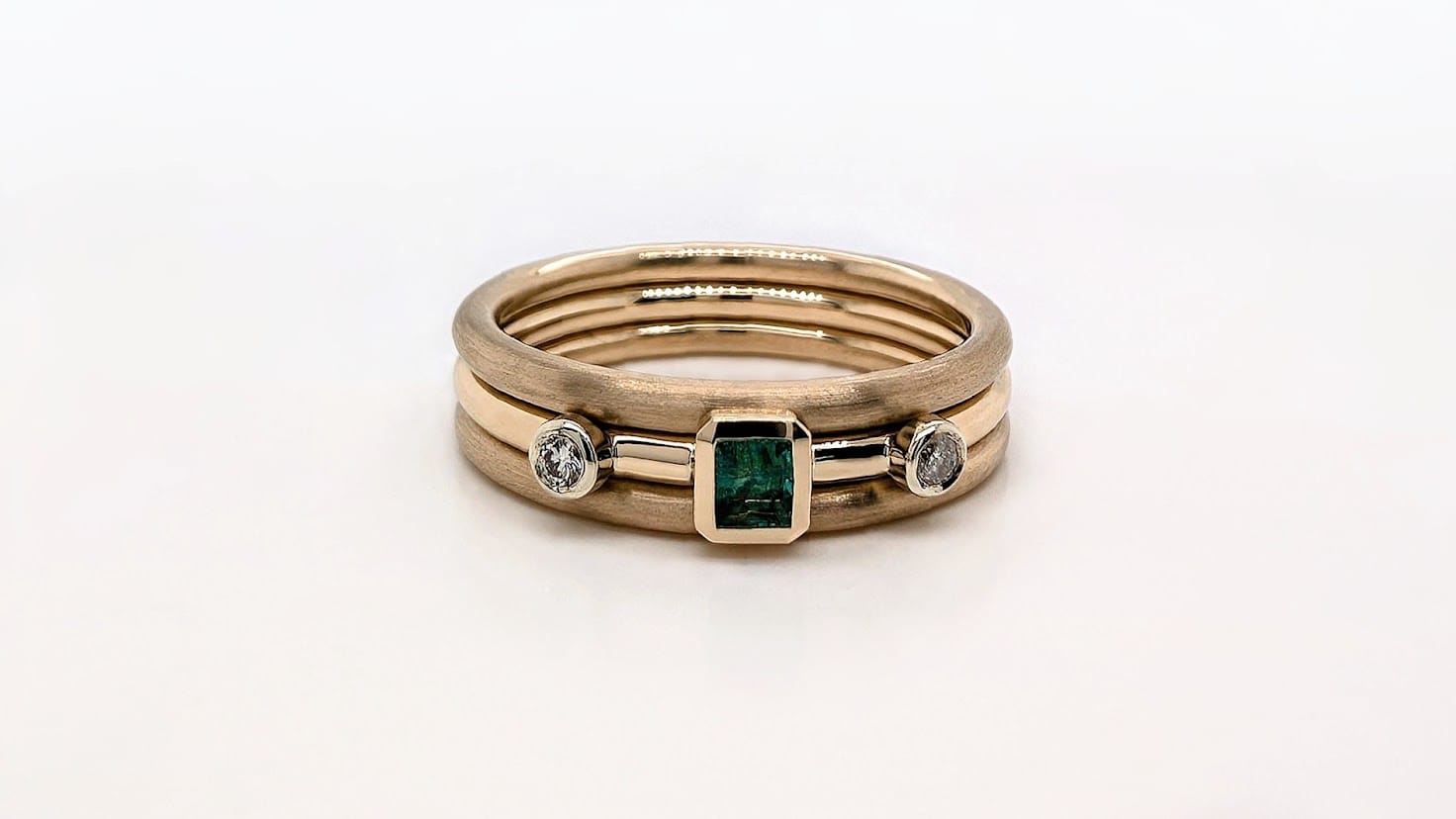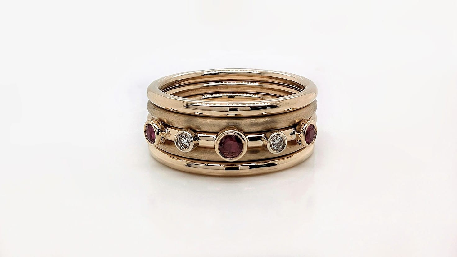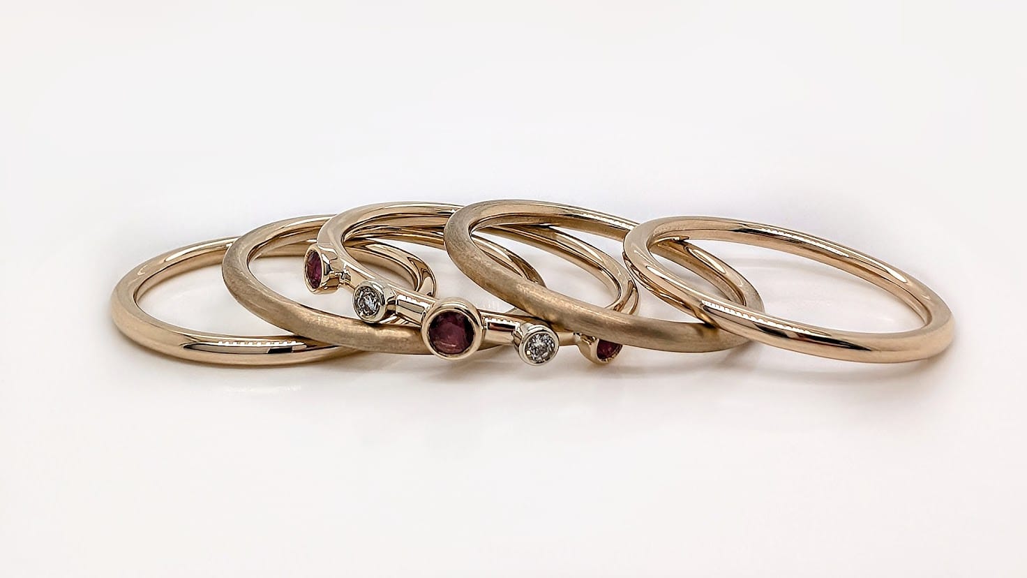 These pieces were created as a continuation of the intricate Sentimental Floral Ring. As there was a large quantity of sentimental material left over after completing the floral ring, we discussed design options that would allow her to wear the different coloured stones and metals in multiple combinations.