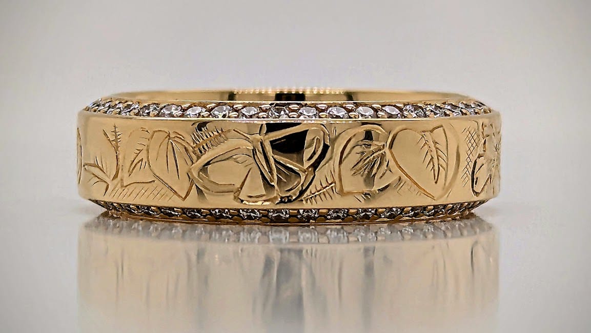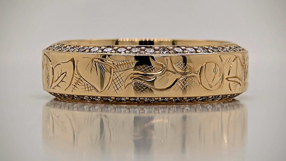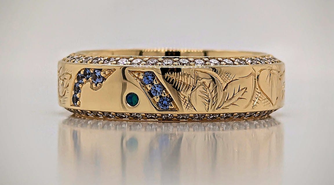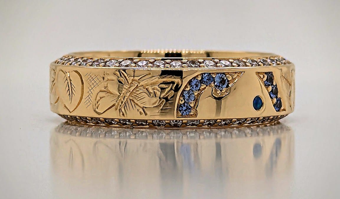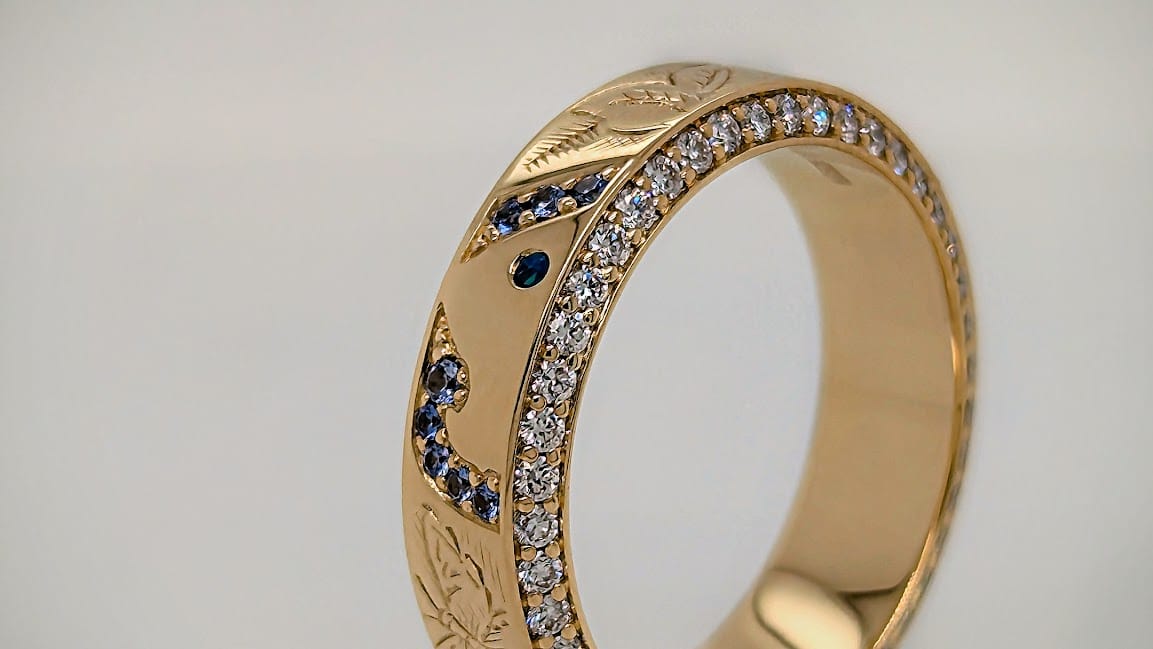 This is a bespoke eternity ring that one of our customers had commissioned for his wife for their 25th wedding anniversary. We discussed the design of this ring in length in order to properly capture the personalised elements he wished to include, while also maintaining the aesthetic integrity of the piece.