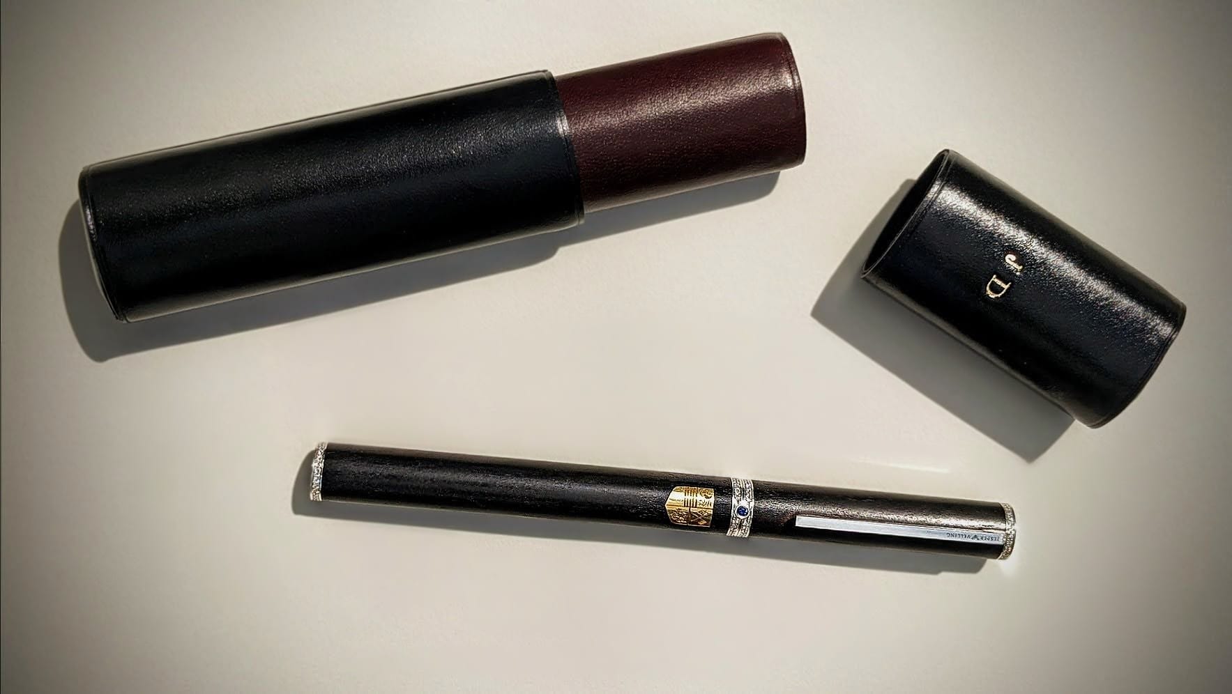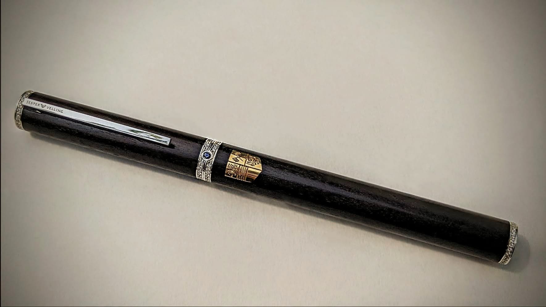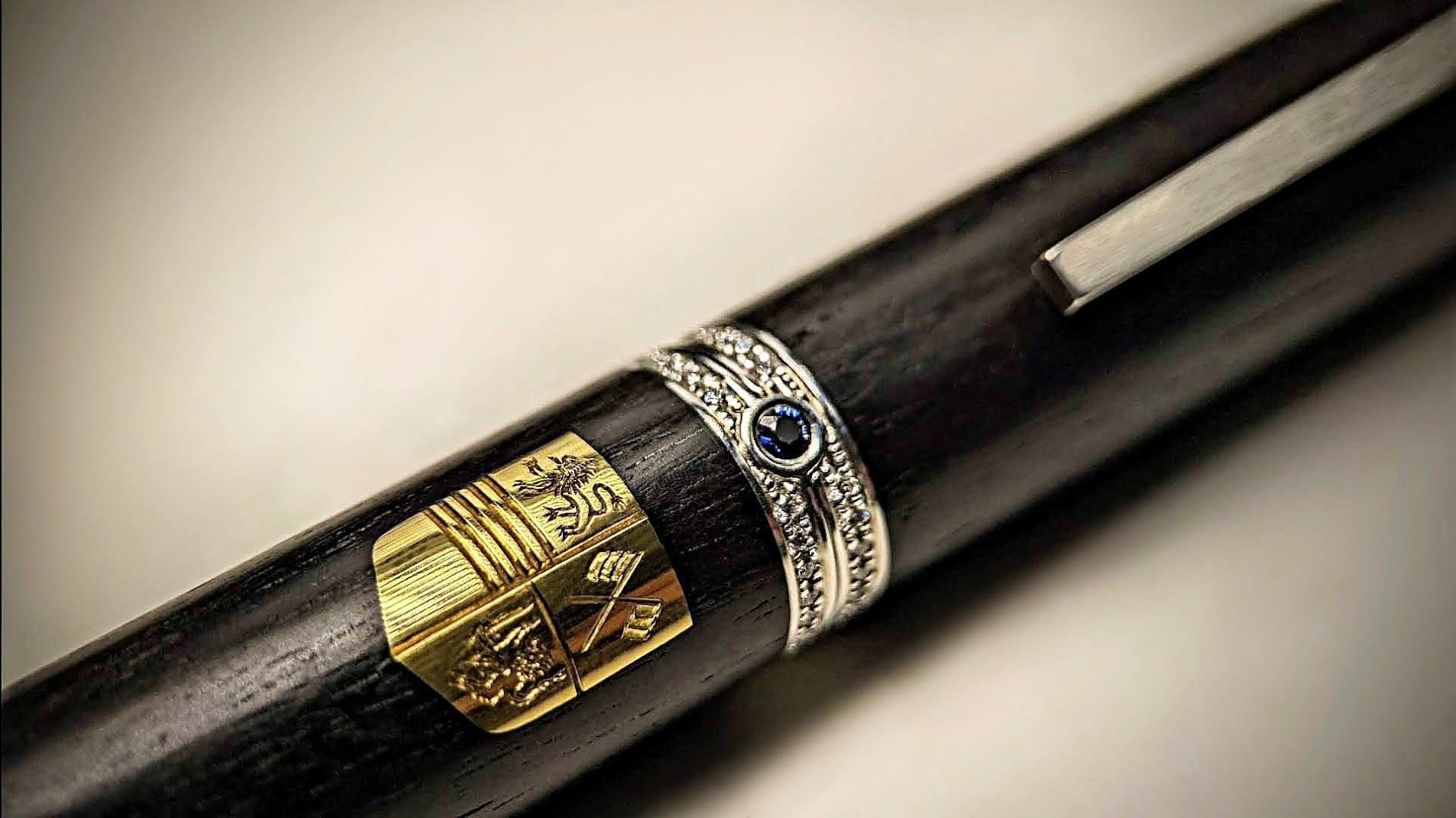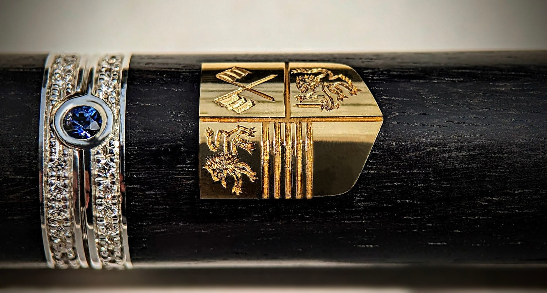 The pen itself is made of ebony and silver, which was turned and shaped on the lathe into the cylindrical components that make up the body and lid. 24ct gold was used to create the shield shape that is inlaid in the ebony, which was then engraved with the customer’s family crest under an incredibly strong microscope- this matches a signet ring that he commissioned from us a while back! The pen was then precisely micro-set with 4 bands of small diamonds, one on the top and bottom of both the body and lid, which totalled over 100 stones! Finally, we set 3 beautiful blue sapphires into the piece: in the middle, on the top of the lid, and on the base. It also has easily interchangeable fountain pen or ballpoint nibs to suit the user’s preference.